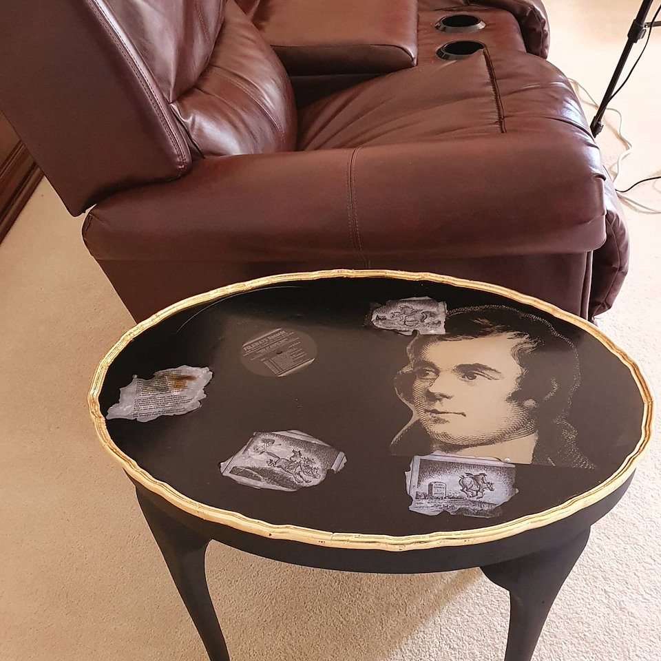A simple table upcycled with a Robert Burns vinyl and vinyl sleeve .